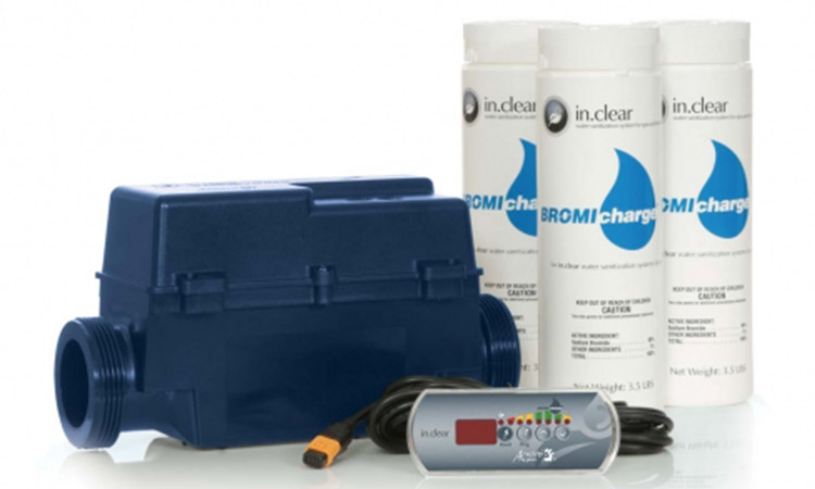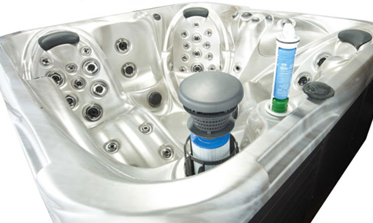 Traitement de l’eau avec une cartouche de minéraux, une cartouche de brome directement intégrées à la plomberie du spa